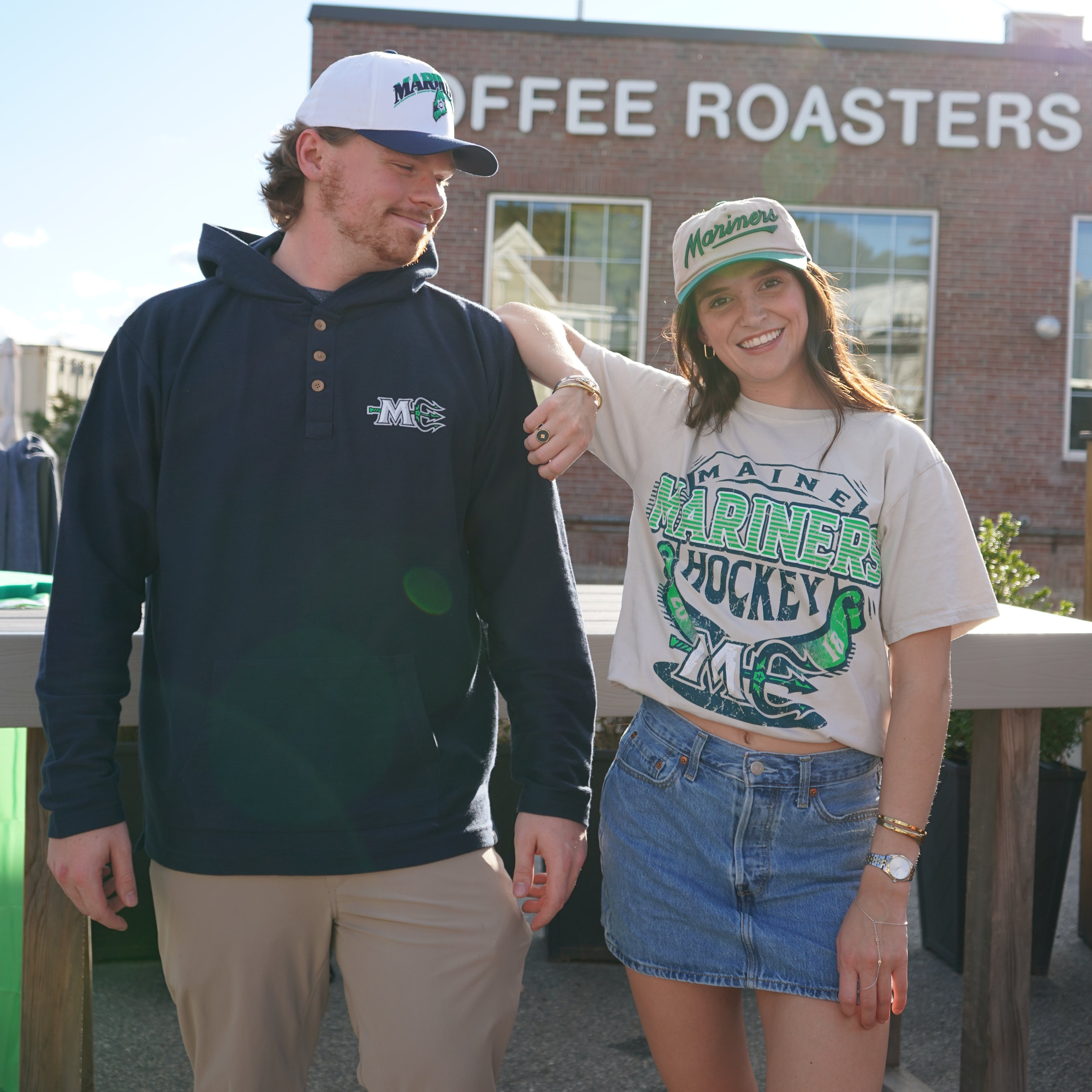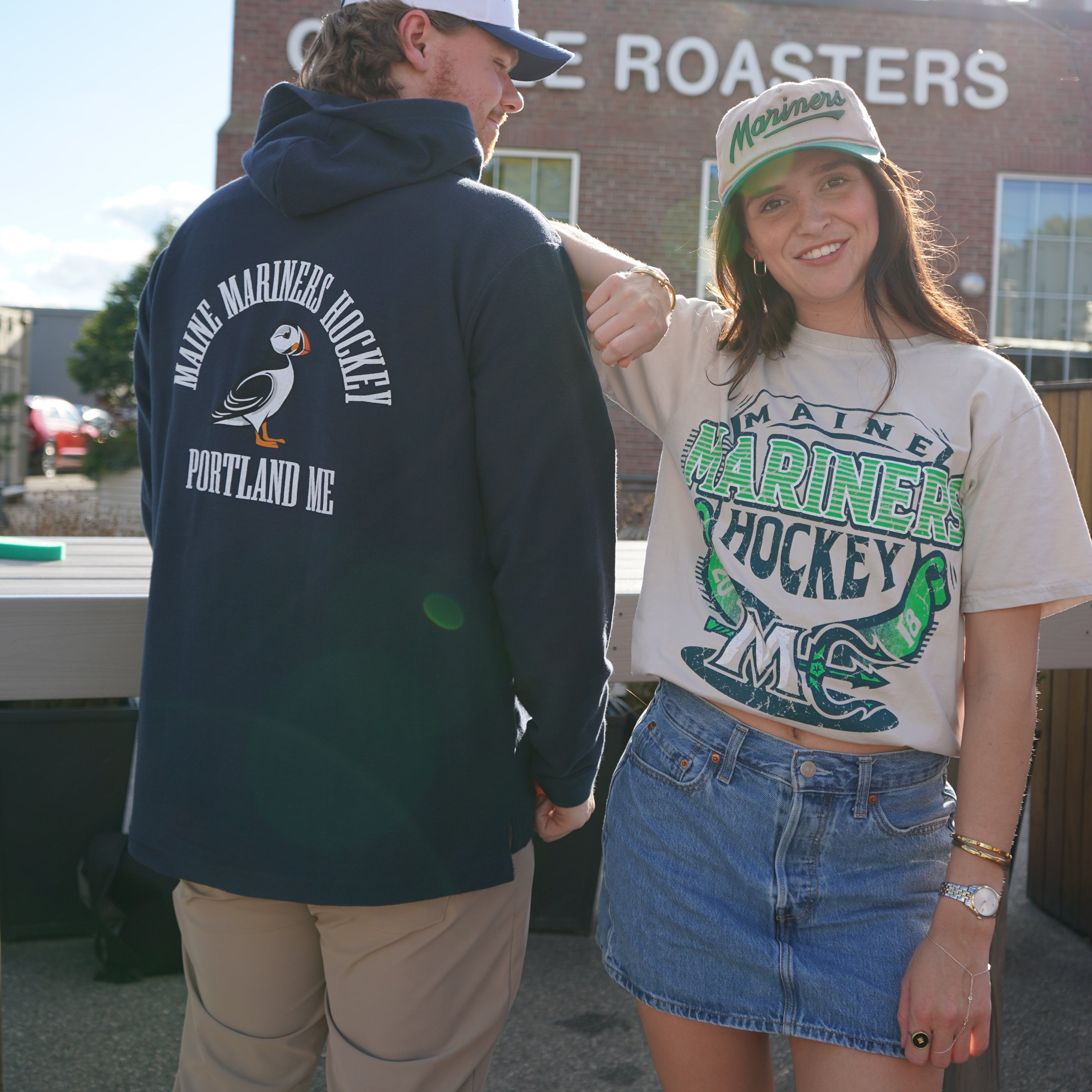 Show off your coastal pride with this fun puffin design! Featuring Maine Mariners Hockey - Portland ME around the puffin graphic with our trident logo on the front. A playful but classic design for fans of all ages. This is an oversize fit.