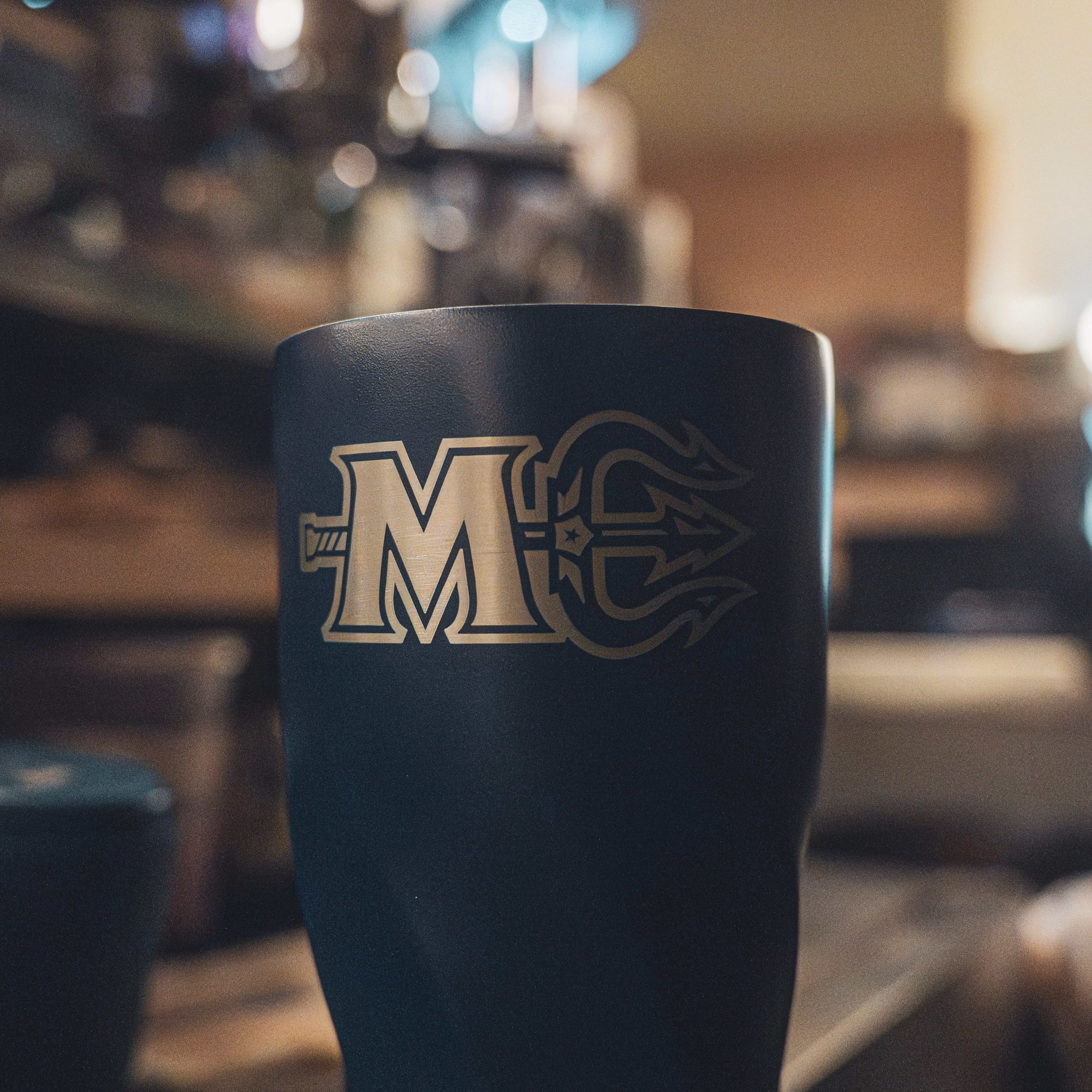 A 30-ounce travel mug in a sleek navy finish, designed to keep your drinks hot or cold for hours. The mug features a contoured shape for a comfortable grip and is decorated with the trident logo on the front. Durable, stylish and ready to go wherever you do!
