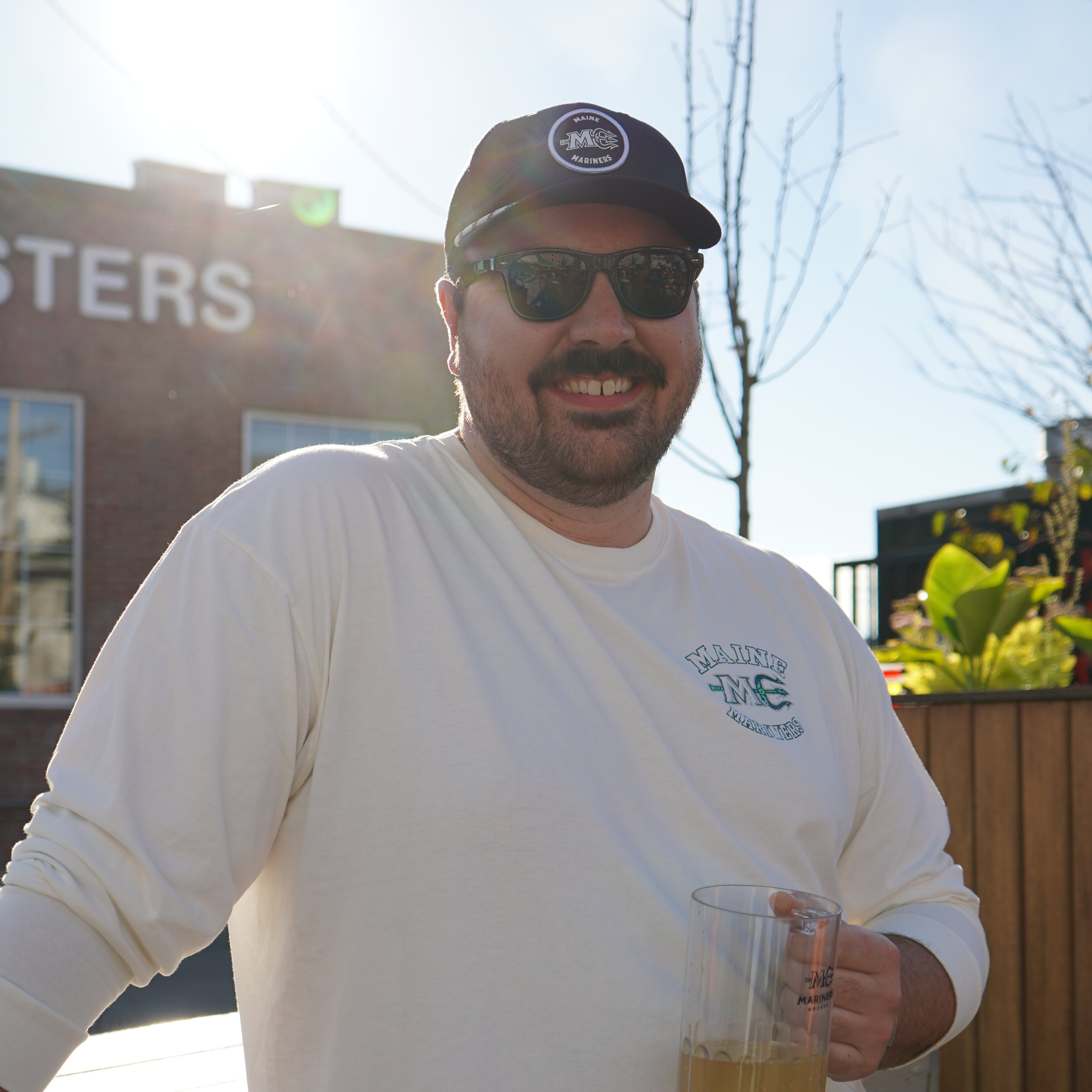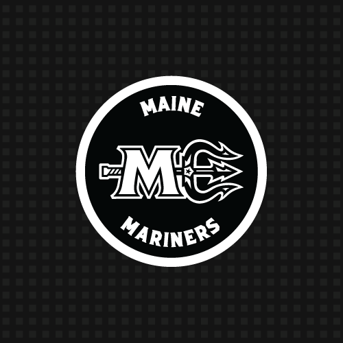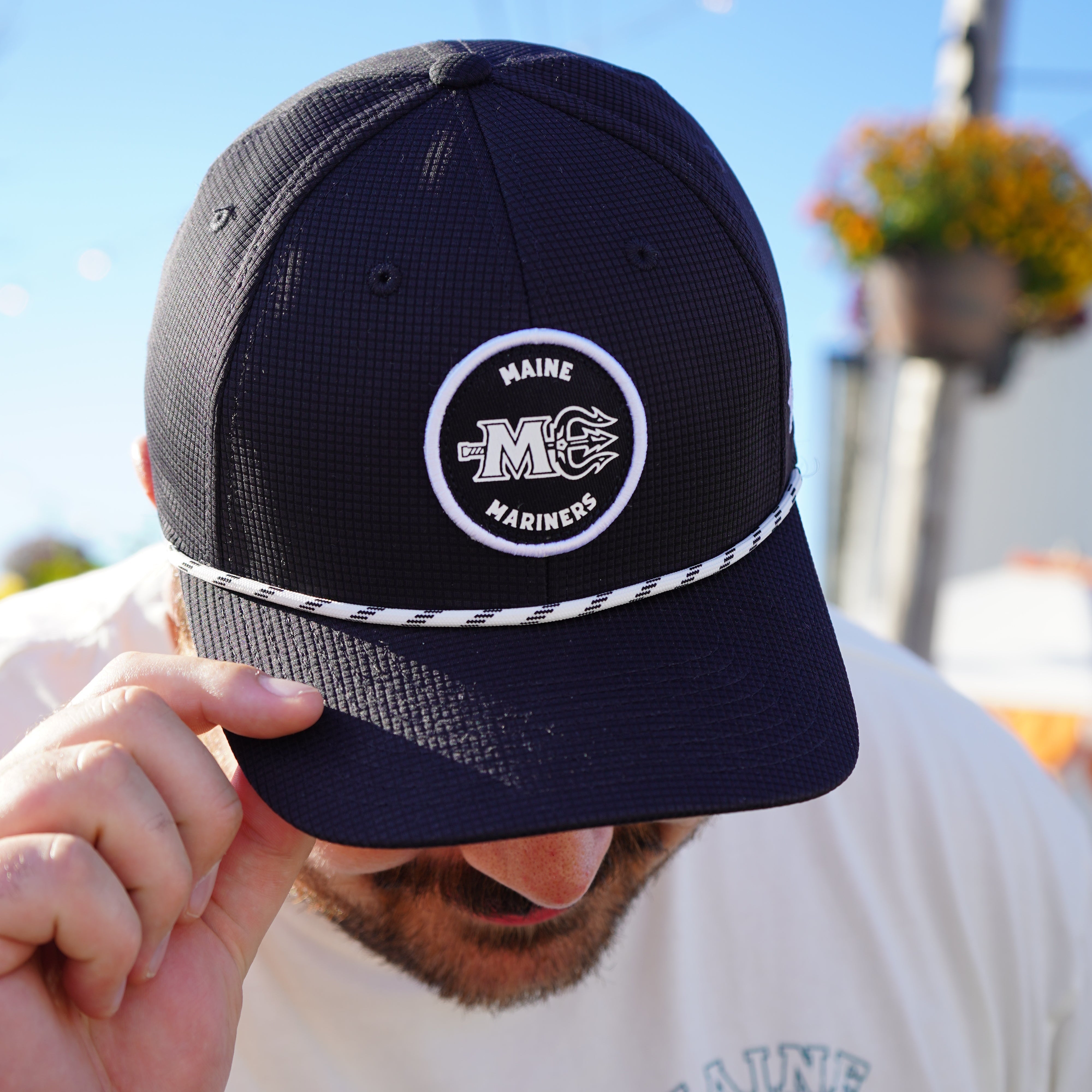 An all black snapback featuring Maine Mariners Hockey in a white circle, with a rope detail running across the front panel above the brim. This design ties hockey style with a everyday touch.