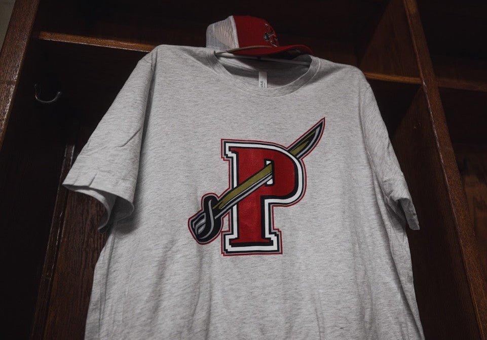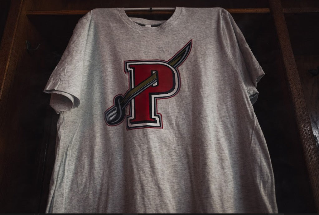 This crisp heather white t-shirt is a take on the classic Pirates saber shoulder patch logo. Made in collaboration with local Maine based company Beauty Unis, this t-shirt is sure to be a classic in any hockey lovers closet.